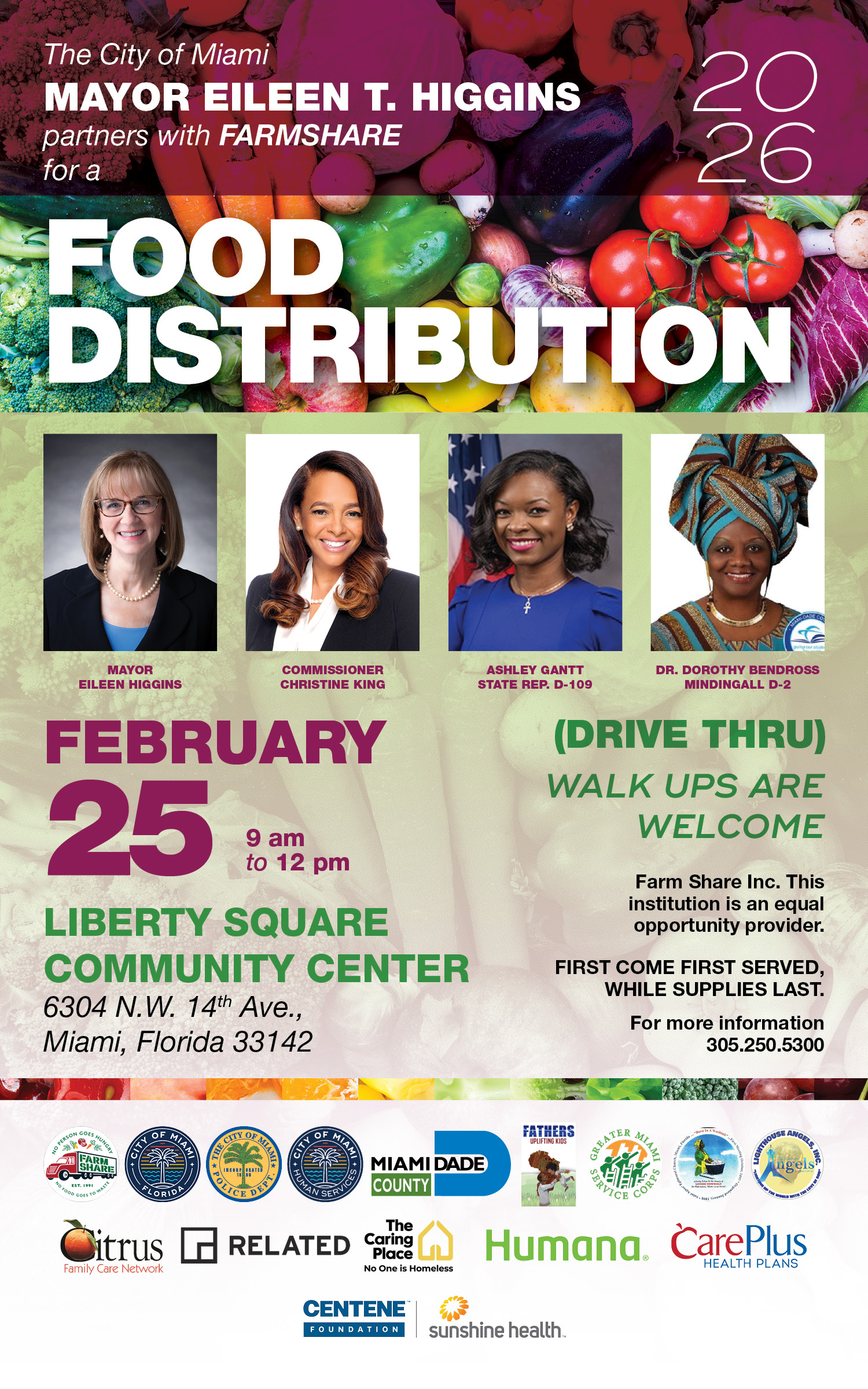 The City of Miami Mayor Eileen T. Higgins partners with FARMSHARE for a Food Distribution on February 25th, 2026 between 9:00am and 12:00pm.